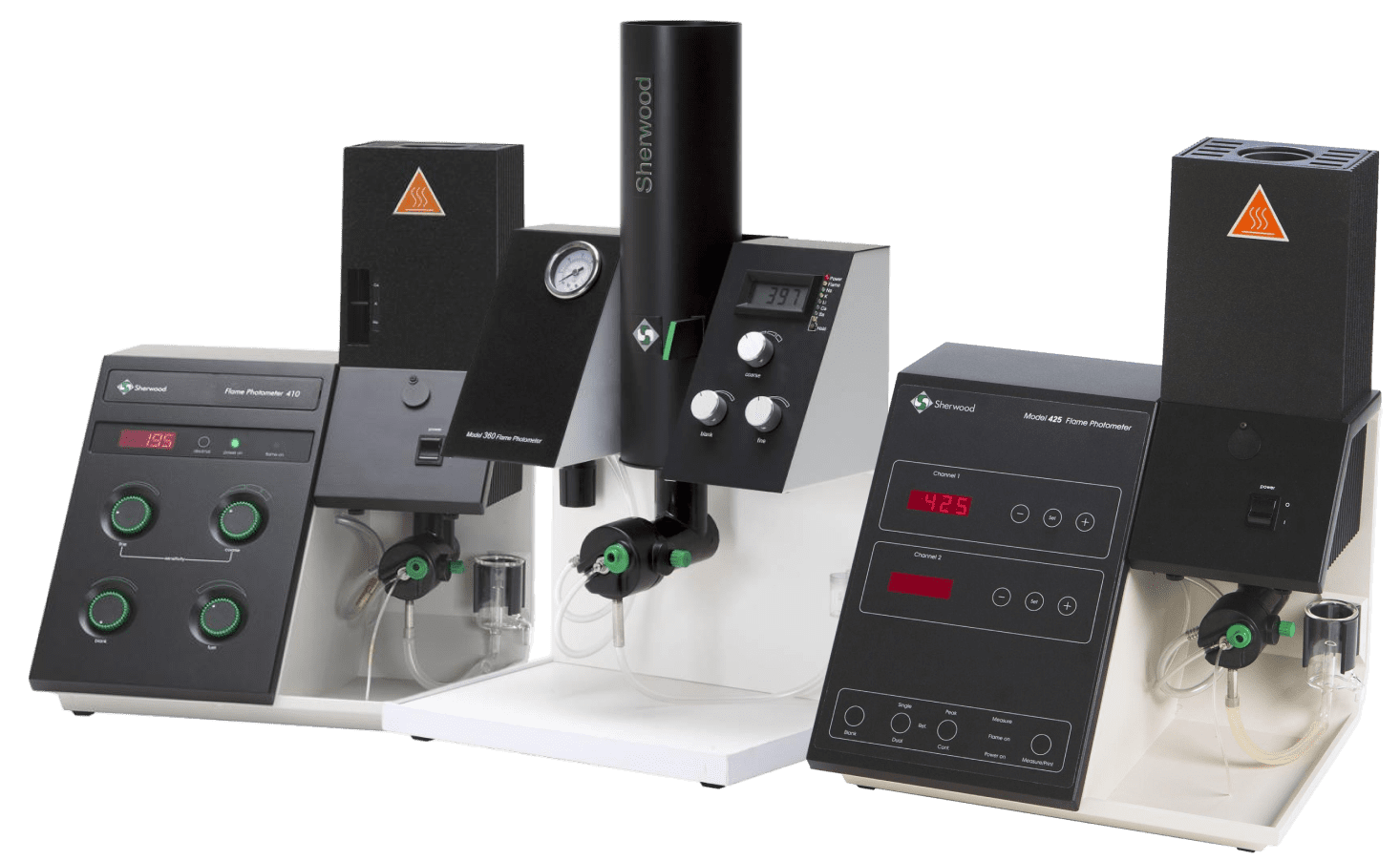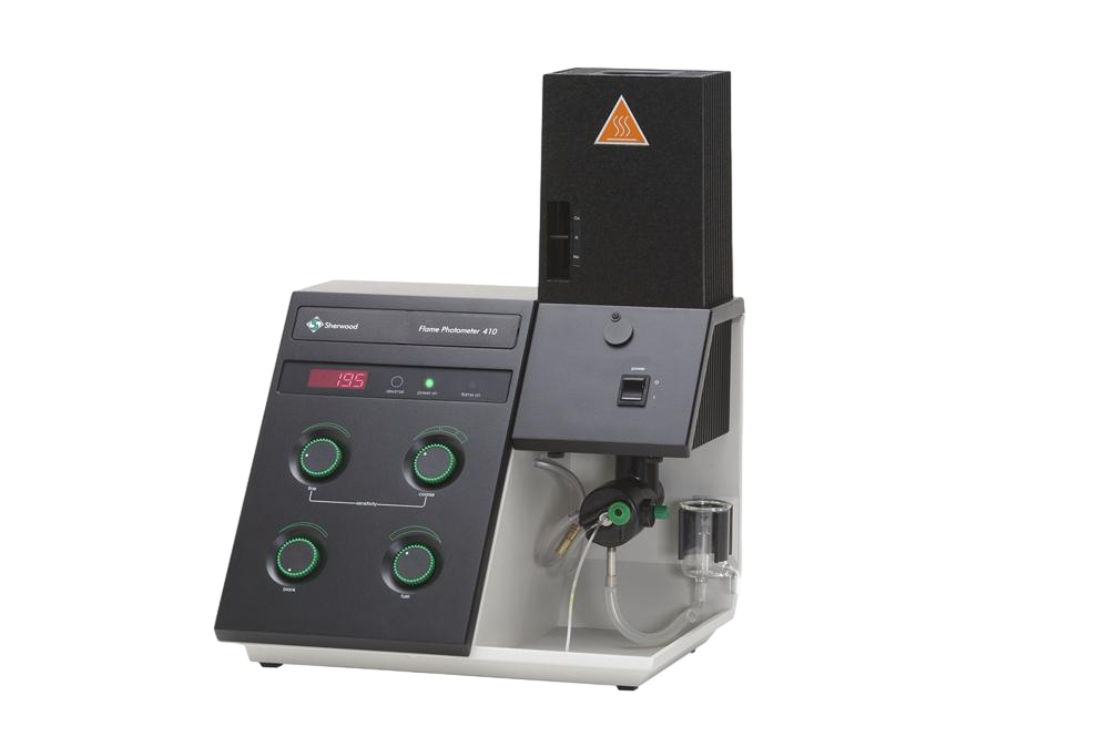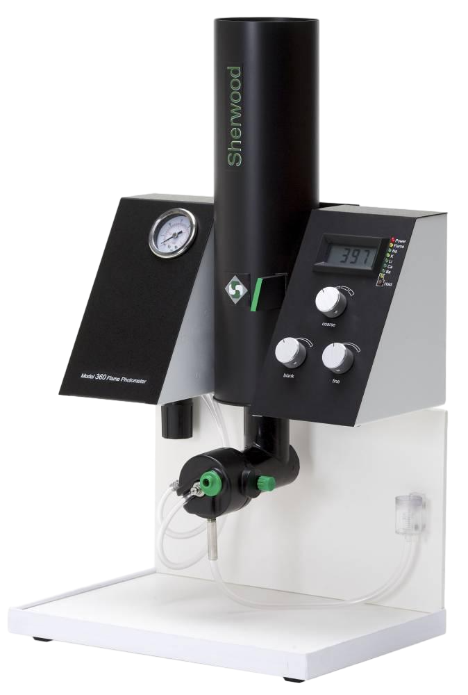 Соответствующие фильтры для анализа элемента выбираются на фильтровом стержне. Информация о выбранном фильтре отображается на светодиодном дисплее, который расположен на лицевой панели блока электроники. Также там отображается состояние пламени и имеется индикатор кнопки «удержания» результатов. Функция «удержания» позволяет фиксировать результат на экране дисплея и высвечивать их до тех пор, пока тот не будет записан, даже если оператор в данный момент удалился от прибора. Инженеры Sherwood обнаружили, что использование этой функции заметно увеличивает воспроизводимость результатов. Для удобства работы, регулятор воздуха и манометр доступен на передней панели устройства.